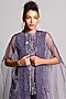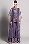 Featuring a jupiter long top in crepe base with pleats and tropical print. It is paired with matching pants and an organza cape.