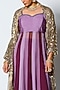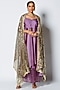 Featuring a lavender short anarkali in dupion, georgette, and organza base with multiple panels and embroidery. It is paired with matching palazzo pants and a net dupatta.