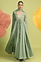 Featuring a matcha green anarkali in chanderi, organza and soft spun muslin base with trim detail. It is paired with an inner and a dupatta. Accentuate it with statement jewellery and heels for a festive occasion, wedding or mehendi ceremony.