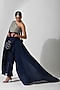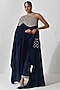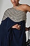 Featuring a midnight blue one-shoulder cape in crepe base with tassels, trims and hand embroidery. It is paired with matching raw silk wide-legged pants.