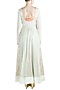 Featuring a mint green and blush pink anarkali set in georgette, chanderi, raw silk and net base. It has Rishi & Vibhuti signature ring tassels.