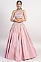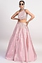 Featuring a pastel pink lehenga in paper silk base with sequins embroidery. It is paired with a matching asymmertical blouse.