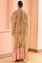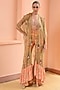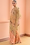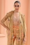 Featuring a peach and sage green cape in crepe and organza base with braided trim and applique work. It is paired with matching pants and a bralette.