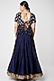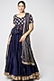 Featuring a royal blue and golden flared lehenga in dupion and tabby silk base. It is paired with a matching embellished blouse and a dupatta.