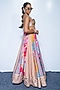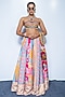 Featuring a sunset marigold yellow flared lehenga in crepe and organza base with geometrical floral print. It is paired with a hand embellished bustier and a dupatta. Accentuate it with dangler earrings and heels for a festive look, cocktail or sangeet ceremony.