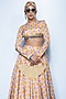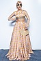 Featuring a sunset saffron colored skirt in crepe base with geometric pattern. It is paired with a blouse having a high-neckline and mirror fringe detail. Accentuate it with statement earrings and heels for pre-wedding events.