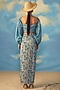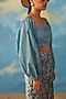 Featuring a turquoise crop top in cotton lurex and crepe base. It is paired with a matching draped skirt with print.