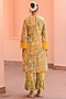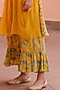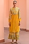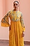 Presenting an elegant yellow anarkali in crepe base with braided trim and applique embroidery. It is paired with pants. Style this designer anarkali set with dangler earrings for festive occasions, showcasing style and sophistication.