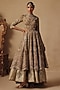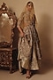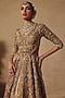 Featuring a gold gown in tissue and brocade base with hand embroidery. Accentuate it with polki dangler earrings and wedges for evening or cocktail soirees.