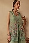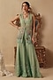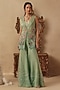 Featuring a green jacket in organza base with hand embroidery. It is paired with embroidered sharara pants and a chanderi bustier. Accentuate it with polki earrings and wedges for mehendi or wedding ceremonies.