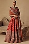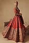 Featuring an orange lehenga in raw silk and organza base with hand embroidery. It is paired with a blouse and a dupatta. Accentuate it with polki dangler earrings and wedges for sangeet or wedding ceremonies.