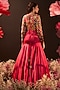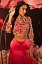 Featuring a pink mermaid draped lehenga in sumo satin base. It is paired with a net moti hand-embroidered blouse. Accentuate it with statement earrings and heels for a bridesmaid look or a sangeet ceremony.