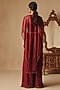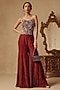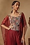 Featuring a wine cape in organza, shimmer crepe and net base. It is paired with sharara pants and a corset having beadwork. Accentuate it with polki earrings and wedges for sangeet or wedding ceremonies.