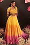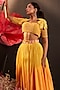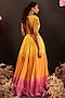 Featuring a yellow ombre gathered lehenga in organza base with floral belt detail. It is paired with a net blouse having moti embroidery and floral detail. Accentuate it with statement earrings and heels for a bridesmaid look or a haldi ceremony.