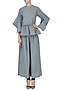 This set features a blue and white striped peplum top in cotton chambray base with gathered hem and flared sleeves. It is paired with matching palazzo pants.