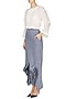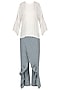 Featuring a white tunic in habutai silk base with pin tucked bib design and ruffle detailing on sleeves. It is paired with blue and white striped wrap pants in cotton chambray.