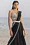 Featuring a black lehenga saree in organza base with hand embroidered border and block pallu. It is paired with a matching bustier having hand embroidery and a belt. Accentuate it with statement jewellery and heels for a wedding, sangeet or engagement ceremonies.