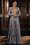 Ritika Mirchandani presents an ice blue and gold jacket in crepe, double georgette and net base. It is paired with sharara pants and an embroidered V-neck blouse. Accentuate it with zircon jewellery, an embellished clutch and elegant heels for a stylish ensemble, ideal for festive occasion, cocktail and sangeet ceremonies.