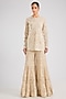 Featuring an ivory kurta in crepe, net and double georgette base with a high neckline, dori, floral, crystal bugle beads and thread embroidery. It is paired with embroidered sharara pant. Accentuate with diamond stud earrings, potli bag and metallic heels for festive occasions, cocktail or sangeet ceremonies.