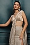 Ritika Mirchandani presents an ivory and gold lehenga saree in crepe, double georgette and net base with a side slit, crystal, bugle beads and thread embroidery. It is paired with a tapered embroidered blouse. Accentuate it with zircon jewellery, an embellished clutch and elegant heels for a stylish ensemble, ideal for cocktail and sangeet ceremonies.