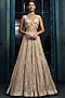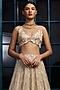 Ritika Mirchandani presents an ivory and gold lehenga in crepe, double georgette and net base with crystal, bugle beads and thread embroidery. It is paired with a floral embroidered blouse and a dupatta. Accentuate it with zircon jewellery, an embellished clutch and elegant heels for a stylish ensemble, ideal for cocktail and sangeet ceremonies.