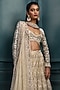 Ritika Mirchandani presents an ivory and gold lehenga in crepe, double georgette and net base with floral, crystal, bugle beads and thread embroidery. It is paired with an embroidered blouse having V-neckline and a dupatta. Accentuate it with zircon jewellery, an embellished clutch and elegant heels for a stylish ensemble, ideal for weddings, cocktail and sangeet ceremonies.