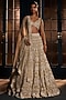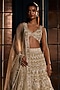 Ritika Mirchandani presents an ivory and gold lehenga in crepe, double georgette and net base with crystal, bugle beads and thread embroidery. It is paired with an embroidered V-neck blouse and a dupatta. Accentuate it with zircon jewellery, an embellished clutch and elegant heels for a stylish ensemble, ideal for a wedding, engagement or sangeet ceremonies.
