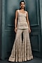 Ritika Mirchandani presents an ivory and gold kurta in crepe, double georgette and net base with a square-neckline, diamond, crystal, bugle beads and thread embroidery. It is paired with sharara pants and a dupatta. Accentuate it with zircon jewellery, an embellished clutch and elegant heels for a stylish ensemble, ideal for festive occasion, cocktail and sangeet ceremonies.