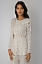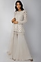 Featuring an ivory kurta in crepe silk and double georgette base with bugle beads, thread and crystal embroidery. It is paired with matching organza sharara pants, a net dupatta and a belt.