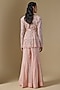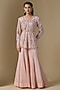 Featuring a soft pink kurta in crepe, double georgette and net base with crystal bugles and thread embellishment. It is paired with sharara. Elevate this designer ensemble with statement jewellery, a metallic clutch and black block heels for a striking look, perfect for grand festive parties, sangeet or pre-wedding ceremonies.