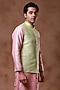 Featuring a green bundi jacket in raw silk and silk base with hand embroidery. It is paired with a kurta and churidar. Style it with shoes for a reception, evening celebration, wedding or engagement ceremony.
