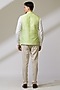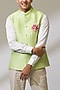 Featuring a green bundi jacket in raw silk and silk base with hand embroidery. Style it with shoes, a white shirt and beige pants for a festive occasion, cocktail or mehendi ceremony, exuding charm and elegance.