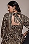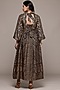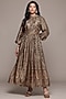 Ritu Kumar presents a black and beige floral maxi dress in silk base. Accentuate it with statement earrings and block heels for an evening look.