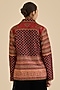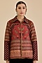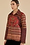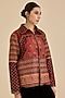 Ritu Kumar presents a black and burgundy jacket in murshidabad silk and silk dupion base with geometric print. Accentuate it with pants, statement jewellery, a clutch and block heels for festive occasions or cultural events.