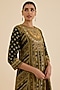 Featuring a black and olive kurta in murshidabad silk base with mirror work and geometric print. It is paired with rayon crepe pants and a viscose chinon dupatta. Accentuate it with kundan polki jewellery and heels for festive occasions or sangeet ceremony.