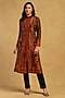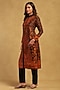 Ritu Kumar presents a black and rust kurta in silk flat dupion base with embroidery. It is paired with silk and dupion pants. Accentuate it with statement jewellery, a clutch and block heels for festive occasions or pooja ceremonies.