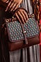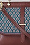 Featuring a blue and tan sling bag in leather base with peacock print. It has a magnet closure.