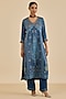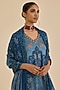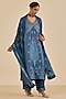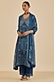 Ritu Kumar presents a blue and turquoise kurta in silk satin base with floral print, machine and hand embroidery. It is paired with rayon crepe pants and a viscose chinon dupatta. Accentuate it with statement jewellery, a clutch and block heels for festive occasions or pooja ceremonies.
