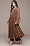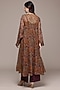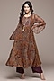 Ritu Kumar presents a brown kurta in viscose chiffon base with paisley print. It is paired with vintage crepe pants. Accentuate it with kundan polki earrings and block heels for festive occasions or pooja ceremonies.