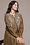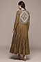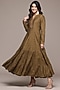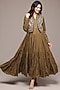 Ritu Kumar presents a dark mustard dress in khadi chanderi base. It is paired with a jacket. Accentuate it with statement earrings and block heels for festive occasions or garden parties.