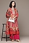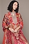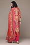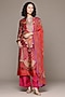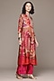 Ritu Kumar presents a fuchsia and purple kurta in murshidabad silk base with hand and machine embroidery. It is paired with pants and a dupatta. Accentuate it with statement jewellery, a clutch and block heels for festive occasions or pooja ceremonies.