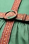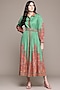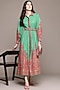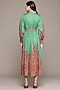 Ritu Kumar presents a green A-line maxi dress in cotton satin base with digital print. Accentuate it with statement earrings and heels for evening soirees.