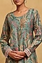 Ritu Kumar presents a green kurta in cotton silk base with botanical print. It is paired with rayon slub pants and a viscose chiffon dupatta. It is crafted with the finest materials and will accentuate your festive look.