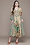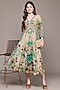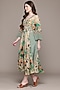 Ritu Kumar features a green maxi dress in viscose crepe base. Style it with statement earrings, strappy heels, and a stack of delicate bangles for festive gatherings, destination weddings, sundowner parties, or elegant evening celebrations