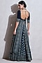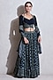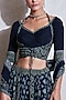 Featuring an indigo blue and sea green blouse in rayon and crepe base with sweetheart neckline, half sleeves, and thread hand embroidery. It is paired with a matching skirt and a jacket.
