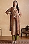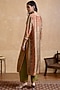 Ritu Kumar presents a khaki kurta in murshidabad silk base with floral print. It is paired with rayon crepe pants and a viscose chinon dupatta. Accentuate it with block heels and statement earrings for festive ceremonies.