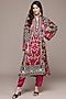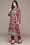 Ritu Kumar presents a red kurta in modal satin base with geometric print. It is paired with dehri satin pants. Accentuate it with kundan polki earrings and block heels for festive occasions or pooja ceremonies.