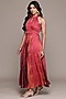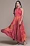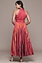 Ritu Kumar features a red sleeveless maxi dress in viscose dobby base with a halter neckline. Style it with statement earrings, strappy heels, and a stack of delicate bangles for festive gatherings, destination weddings, sundowner parties, or elegant evening celebrations
