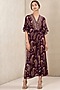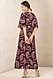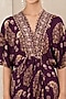 Featuring a violet kaftan dress in viscose crepe base with print. It is paired with a matching bustier.