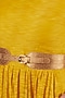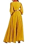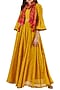 Featuring a yellow kurta in chanderi slub base with full sleeves and band collar. It is paired with contrasting coral printed scarf in viscose chiffon base and golden belt in mushroo base.